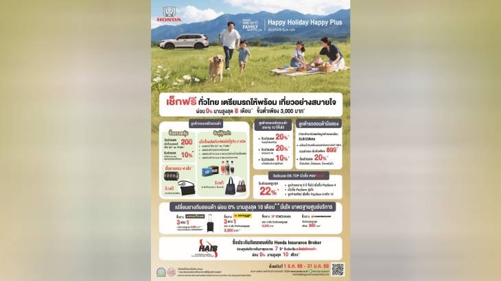 ฮอนด้า เสิร์ฟความอุ่นใจรับลมหนาว ! กับแคมเปญ “Happy Holiday Happy Plus! เที่ยวทั่วไทย คุ้มสบายใจ” บริการตรวจเช็กรถยนต์ฟรีพร้อมแพ็กเกจสุดพิเศษผ่อนสบาย 0% สูงสุด 8 เดือน* สำหรับครอบครัวฮอนด้าทุกคน ที่ศูนย์บริการทั่วประเทศ ระหว่างวันที่ 1 ธ.ค. 68 – 31 ม.ค. 69