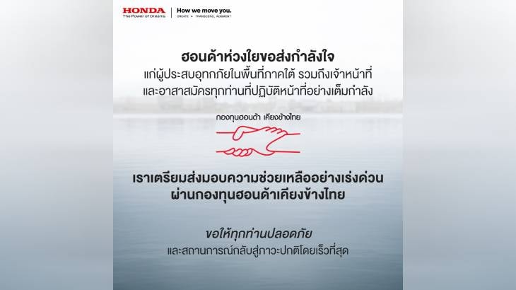 (กรุงเทพฯ – 26 พฤศจิกายน 2568) จากสถานการณ์อุทกภัยที่ทวีความรุนแรง และส่งผลกระทบต่อการดำเนินชีวิตของประชาชนในหลายพื้นที่ทางภาคใต้ ณ ขณะนี้ บริษัท ฮอนด้า ออโตโมบิล (ประเทศไทย) จำกัด ขอแสดงความห่วงใยต่อผู้ประสบอุทกภัย พร้อมส่งกำลังใจถึงเจ้าหน้าที่และอาสาสมัครทุกท่านที่ทุ่มเทแรงกายแรงใจในการช่วยเหลืออย่างเต็มกำลัง